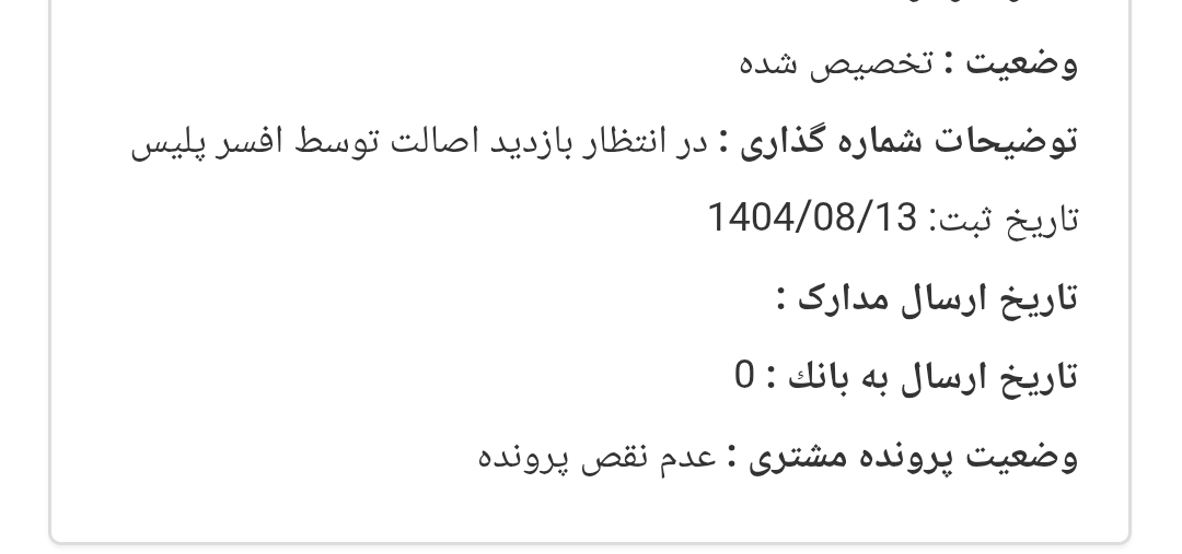 دوستانی که فاکتور شدن به بار دیگه وضعیت خودروی مشتری رو چک کنید ببینید جلوی توضیحات شماره گذاری خالی هست یا نه؟چون برا من الان نگاه کردم زده در انتظار بازدید اصالت توسط افسر پلیس تاریخ ثبت 1404/08/13 اینو امروز زده دیروز 12 آبان که فاکتور شد جلوی توضیحات شماره گذاری خالی بود .
