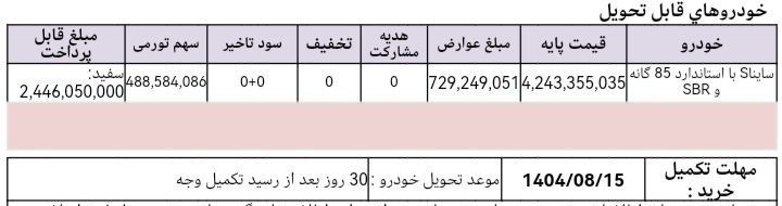 با سلام به همه بزرگواران پذیرش 6 بهمن سال 403 پیش فروش طرح مادران ساینا دوگانه سوز هستم موعد تحویل هفته چهارم تیر ماه تکمیل وجه 11 مرداد هنوز فاکتور نشدم کسی از دوستان اطلاع دقیق داره چه زمانی فاکتور میشود با تشکر