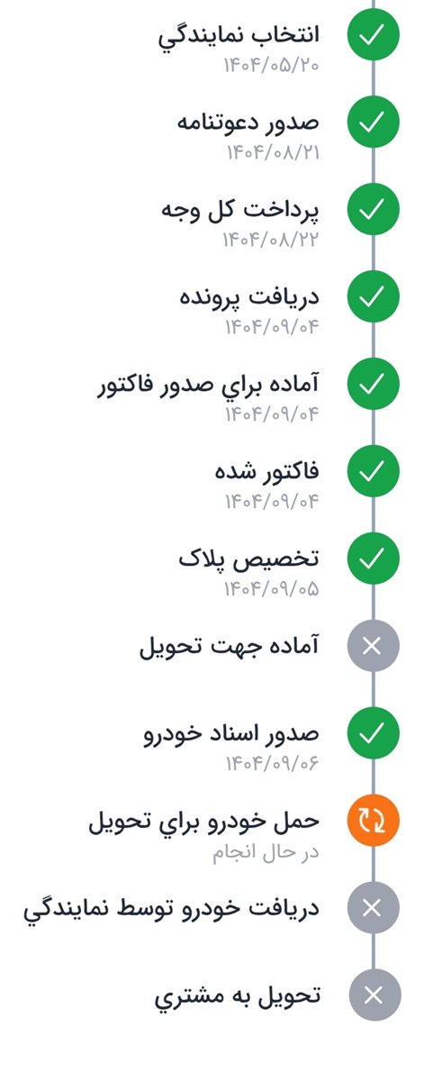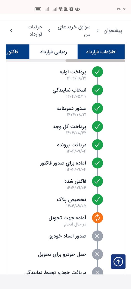 اطلاعات قرارداد ردیابی قرارداد فاکتور فروش اسناد خودرو پرداخت ها انتخاب نمایندگی 1404/05/28 پرداخت کل وجه 1404/05/29 دریافت پرونده 1404/08/27 آماده برای صدور فاکتور 1404/08/27 فاکتور شده 1404/08/27 تخصیص پلاک 1404/08/28 آماده جهت تحویل 1404/09/01 صدور اسناد خودرو 1404/08/29 حمل خودرو برای تحویل 1404/09/06 دریافت خودرو توسط نمایندگی در حال انجام تحویل به مشتری# انشالله قسمت همه
